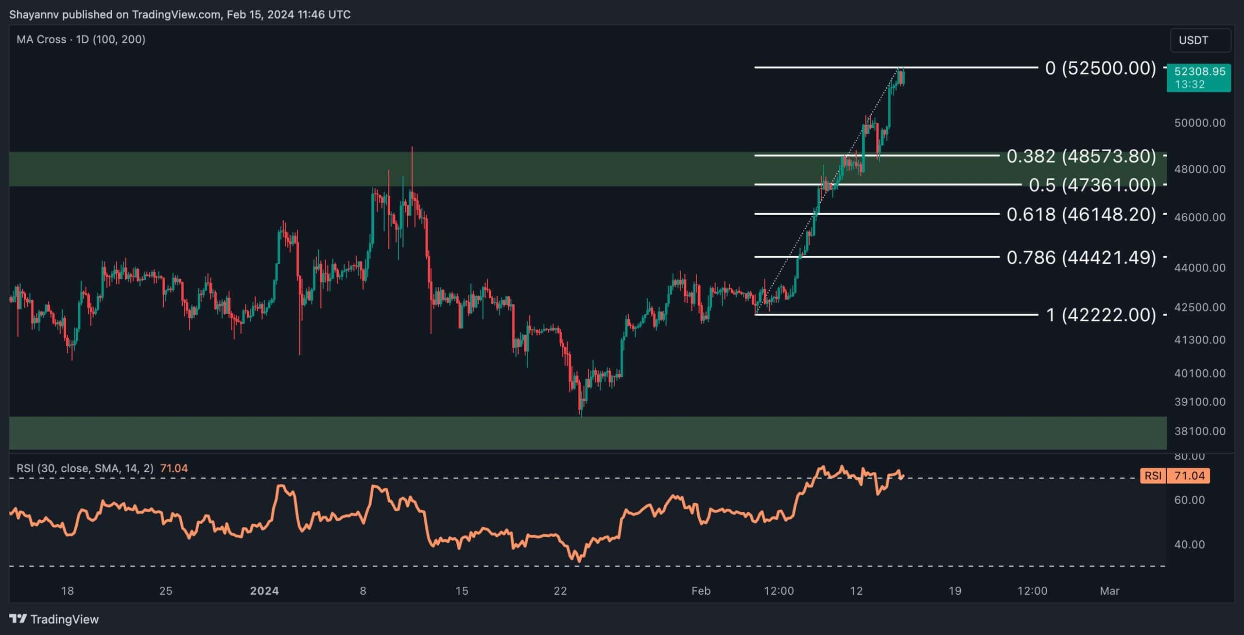Dans un tel scénario, l’objectif de correction serait probablement proche de la fourchette de support cruciale, confinée entre les niveaux de 0,5 (47 361 $) et 0,618 (46 148 $) du retracement de Fibonacci.