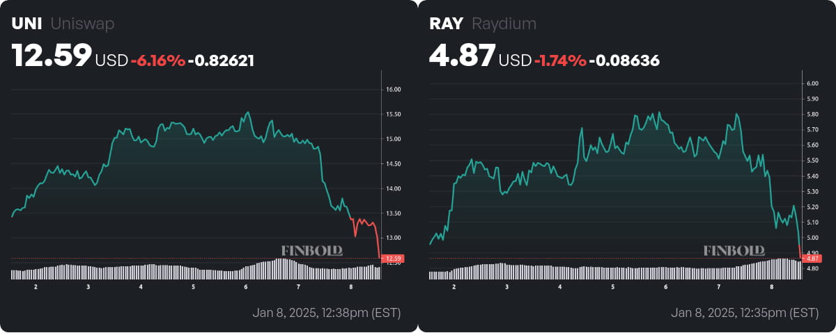 Au moment d’écrire ces lignes, UNI se négocie à 12,59 $ et RAY à 4,87 $, tous deux subissant des pertes. Au cours des sept derniers jours, UNI a chuté de 6,16 % et RAY de 1,74 %, les pertes les plus importantes ayant eu lieu au cours des dernières 24 heures.