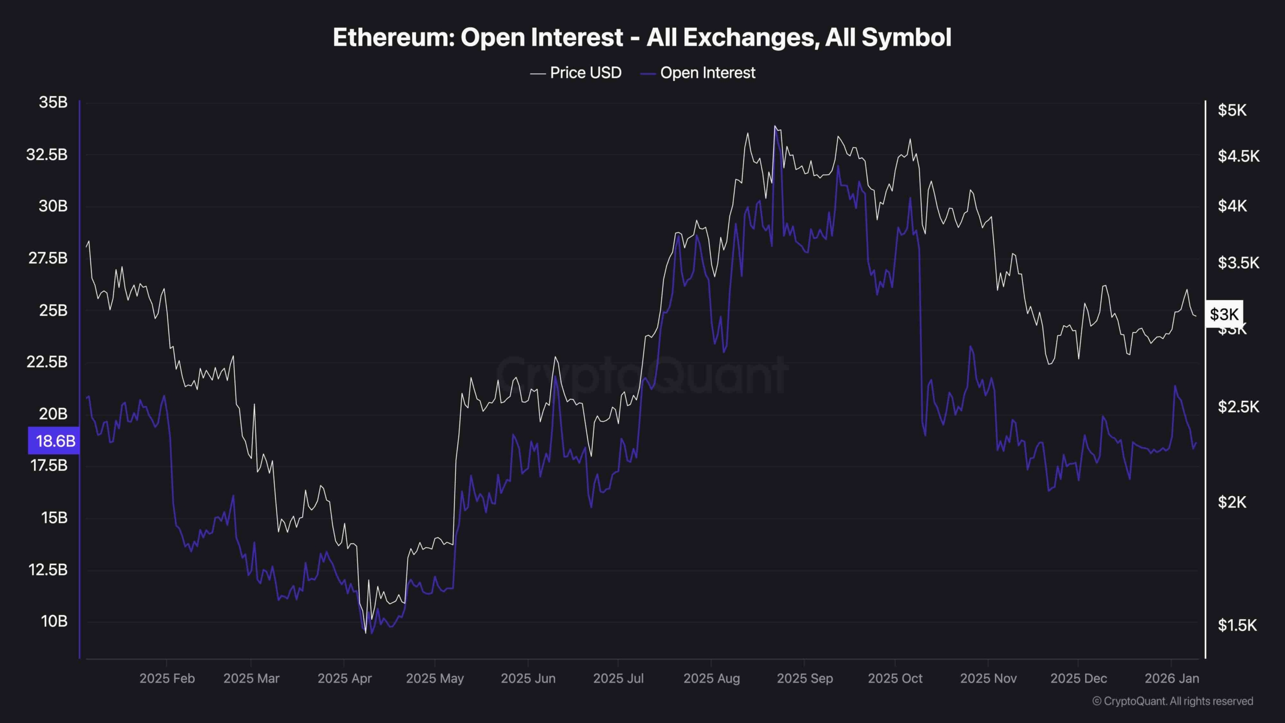 En regardant le graphique des intérêts ouverts d’Ethereum sur toutes les bourses, nous pouvons voir que l’OI reste autour de 18 milliards de dollars, bien qu’en baisse par rapport à son sommet du troisième trimestre 2025. Cela suggère que les traders participent toujours activement au marché, mais sans signes d’effet de levier écrasant. Le récent rebond des prix depuis les plus bas de décembre n’a pas déclenché une poussée des OI, ce qui pourrait être considéré comme sain, dans la mesure où il y aura moins de probabilité de liquidations forcées en cas de retour de la volatilité.