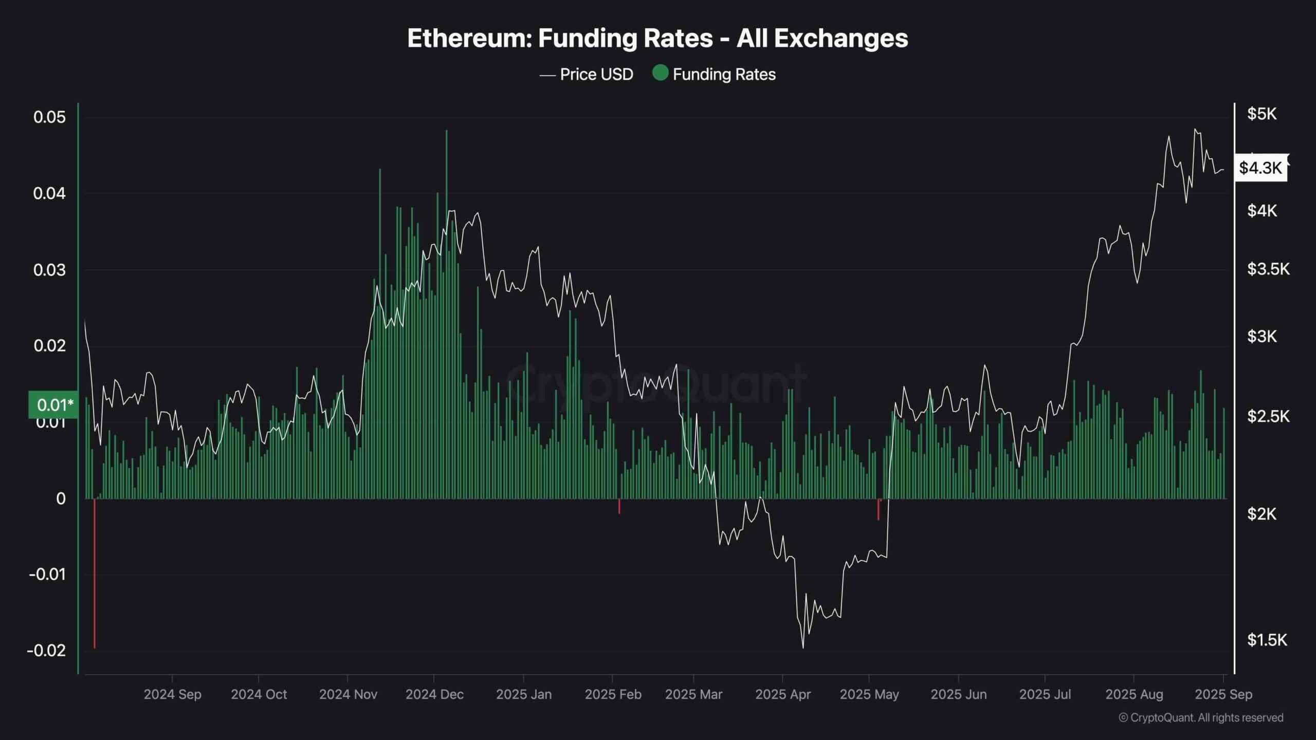 À la fin de 2024, les taux de financement ont augmenté de plus de 0,04 tandis que l’ETH s’est échangé près de 3 800 $ à 4 000 $, reflétant un positionnement long agressif à des prix relativement inférieurs. En revanche, lors du rassemblement d’août 2025, ETH a poussé à un nouveau sommet local près de 4 800 $, mais les taux de financement n’ont culminé qu’environ 0,02 à 0,025 – bien en dessous des extrêmes antérieurs.