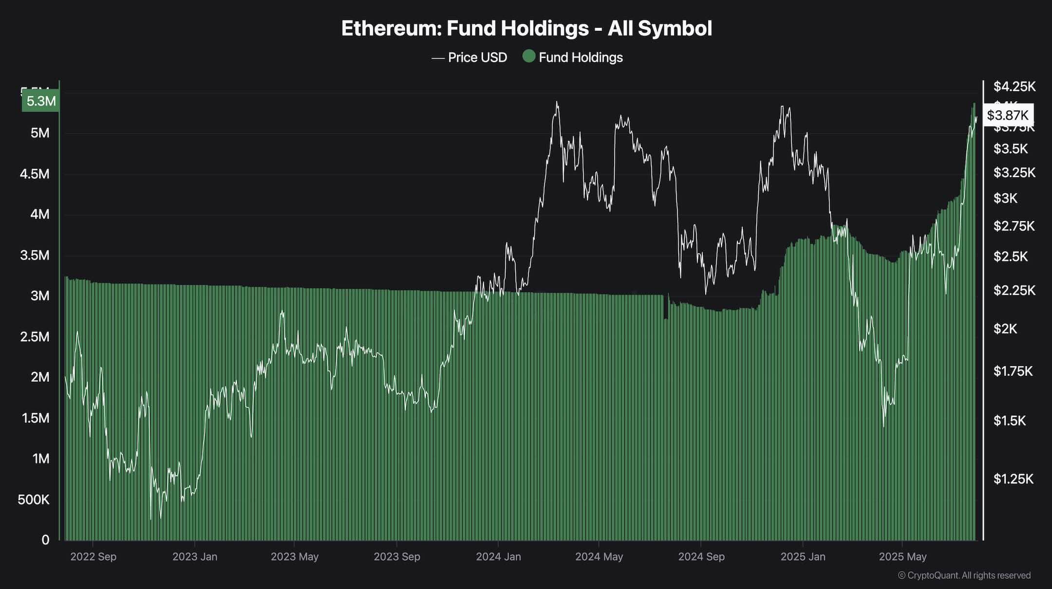 Les dernières données sur Ethereum Fund Holdings montrent une augmentation nette et soutenue, atteignant plus de 5,3 millions d’ETH, marquant le plus haut niveau jamais enregistré. Cette métrique reflète la quantité totale d’ETH détenue par les institutions à travers des véhicules comme les FNB, les fiducies et les fonds axés sur la crypto.