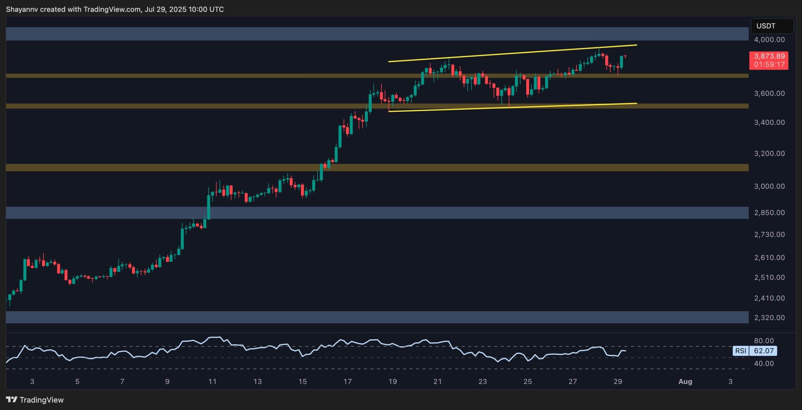 Le prix d’Ethereum est très proche de faire un nouveau sommet en 2025, après la récente course record de Bitcoin. Cependant, il existe certains signes de prudence, car le marché pourrait être surchauffé, comme le suggèrent les indicateurs de momentum. Par conséquent, bien que la structure du marché soit encore optimiste, ce n’est peut-être pas le bon moment pour acheter ETH en raison de son risque.