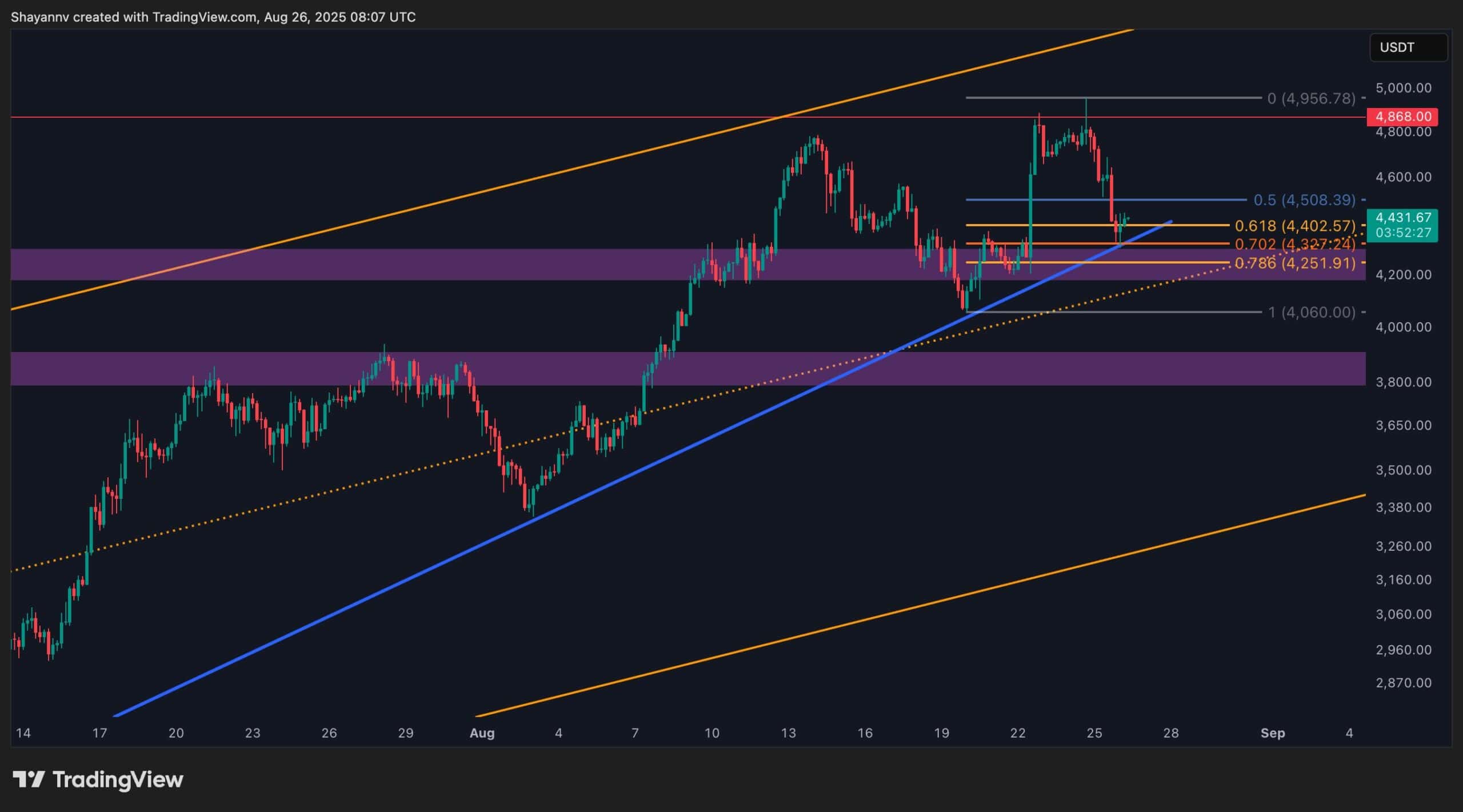 Ethereum a depuis retracé le cluster Fibonacci de 4,4 000 $ (retracement de 0,618–0,702), où il plane actuellement au-dessus du support Trendline. Cette zone de confluence est un champ de bataille critique. Bien que la maintenance au-dessus de 4,4 000 $ puisse alimenter un nouveau test des sommets de 4,9 000 $, la perte de ce niveau ouvrirait probablement la porte à une correction plus profonde vers 4 000 $.