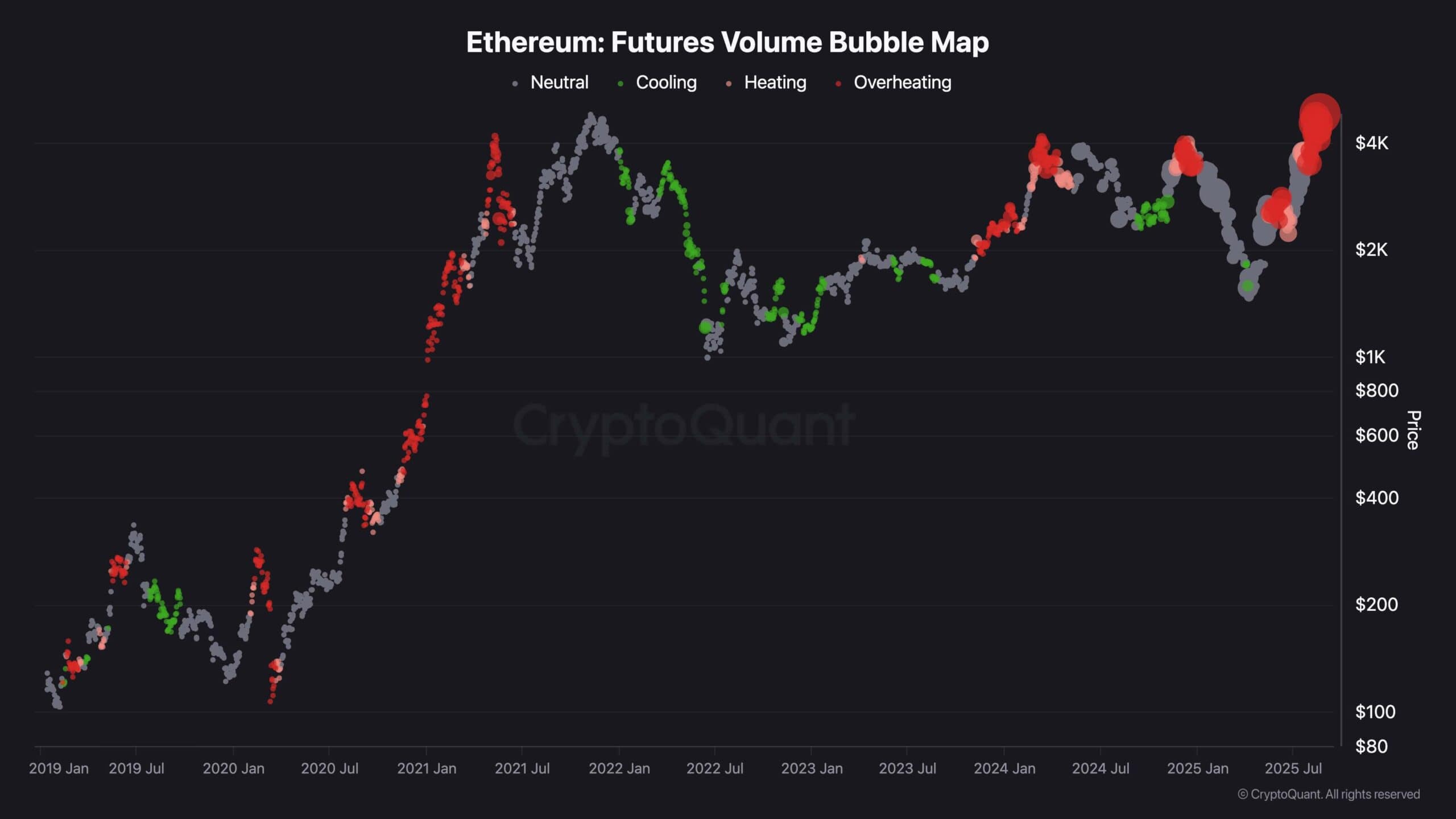 Ethereum a récemment revu ses niveaux élevés de tous les temps près de 4 800 $ à 4 900 $, avec une activité de négociation à terme en parallèle. La carte des bulles de volume à terme donne un aperçu de la façon dont les marchés des dérivés se comportent, offrant une jauge précieuse pour savoir si l’activité spéculative est refroidie ou surchauffée. Cet outil est crucial pour évaluer le risque du marché et identifier les points potentiels d’inversion ou de continuation.