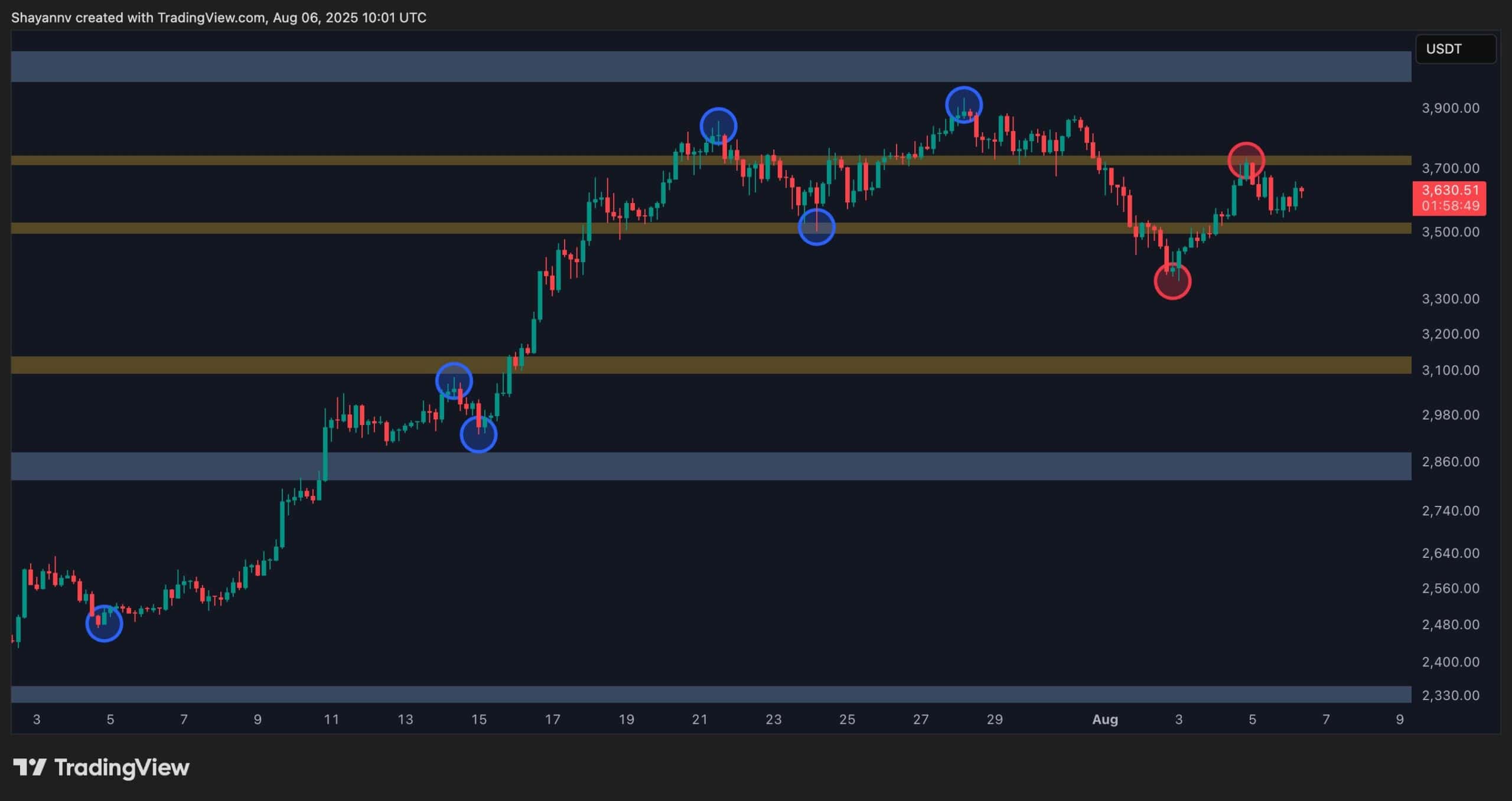 Le graphique de 4 heures montre que l’ETH a balayé les sommets de 3 700 $ et a été rejeté deux fois, formant des sommets égaux et suggérant un peu d’épuisement à court terme. L’actif a maintenant créé un plus bas et potentiellement un creux plus bas après des semaines de structure haussier, ce qui pourrait être le début d’un retrait profond si le niveau de résistance de 3 700 $ se maintient.