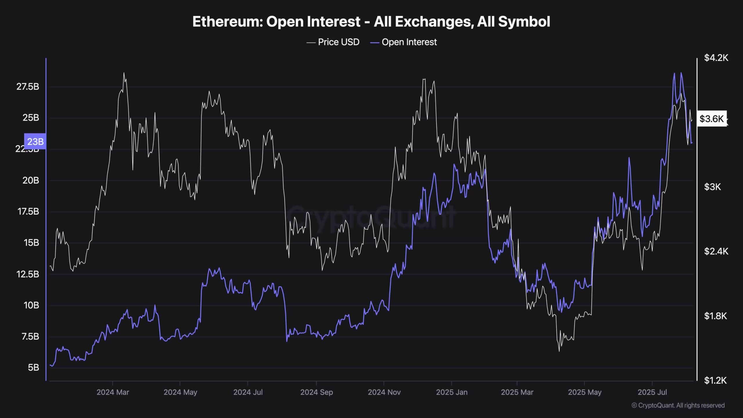 Les intérêts ouverts ont commencé à baisser après avoir culminé près de 28 milliards de dollars au moment où ETH a atteint 3 800 $. Cette légère baisse de l’OI pendant la consolidation suggère que certaines positions longues ont été fermées ou liquidées. Cependant, la tendance plus large est encore clairement à la hausse, avec un intérêt ouvert double depuis mai.