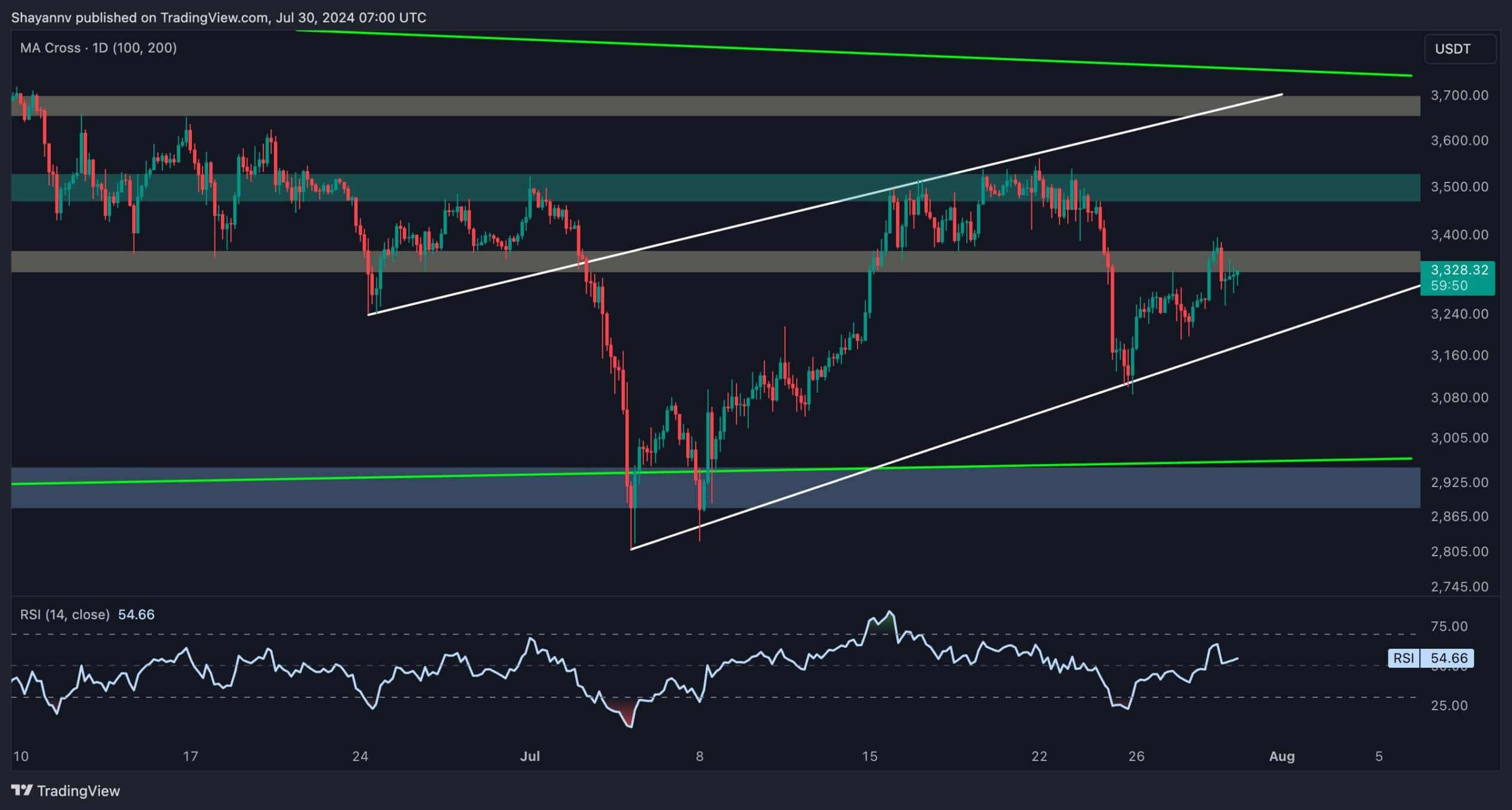 Un examen attentif du graphique journalier d’Ethereum révèle qu’après un rejet près de la région de résistance cruciale de 3 500 $, le prix a chuté vers une zone de support substantielle.