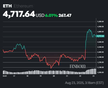 À l’heure de la presse, Ethereum se négociait à 4 713 $, en hausse de 8,5% au cours des dernières 24 heures et près de 6% de plus dans la semaine.