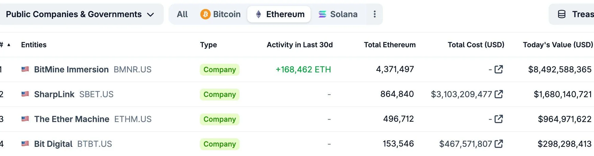 Parallèlement aux avoirs des fondateurs et des premiers contributeurs, les trésoreries d’entreprise Ethereum se sont également développées en 2026. BitMine Immersion se classe actuellement comme la plus grande entreprise identifiée. $ETH titulaire, déclarant environ 4 371 497 $ETH à son bilan, dont une addition nette de 168 462 $ETH au cours des 30 derniers jours. Arrivant en deuxième position, SharpLink détient environ 864 840 $ETHtandis que The Ether Machine contrôle environ 496 712 $ETHarrivant en troisième position dans le plus grand $ETH sociétés de trésorerie.