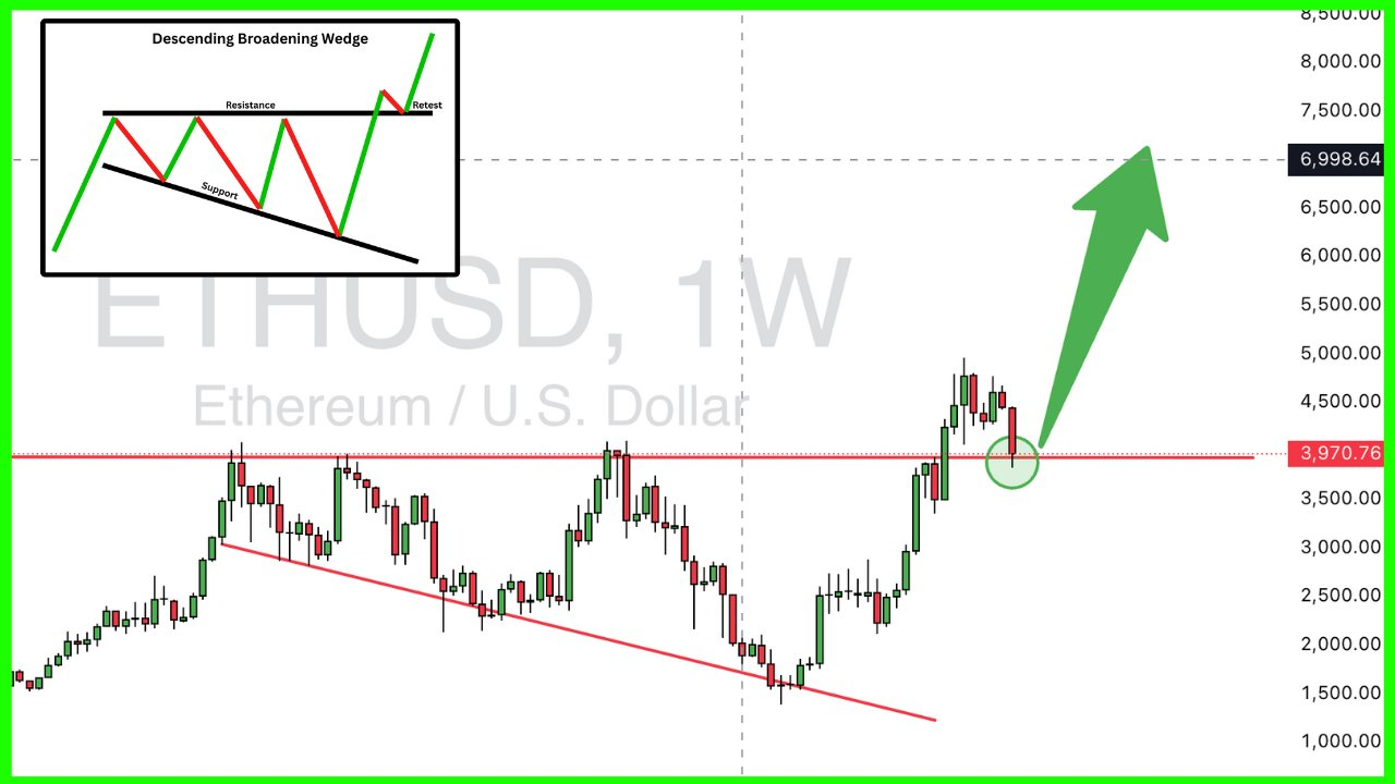 Crypto Analyst The House of Crypto note un coin élargissant descendant se formant sur le graphique hebdomadaire d’Ethereum, qui pourrait pousser ETH jusqu’à environ 6 998 $ s’il éclate.