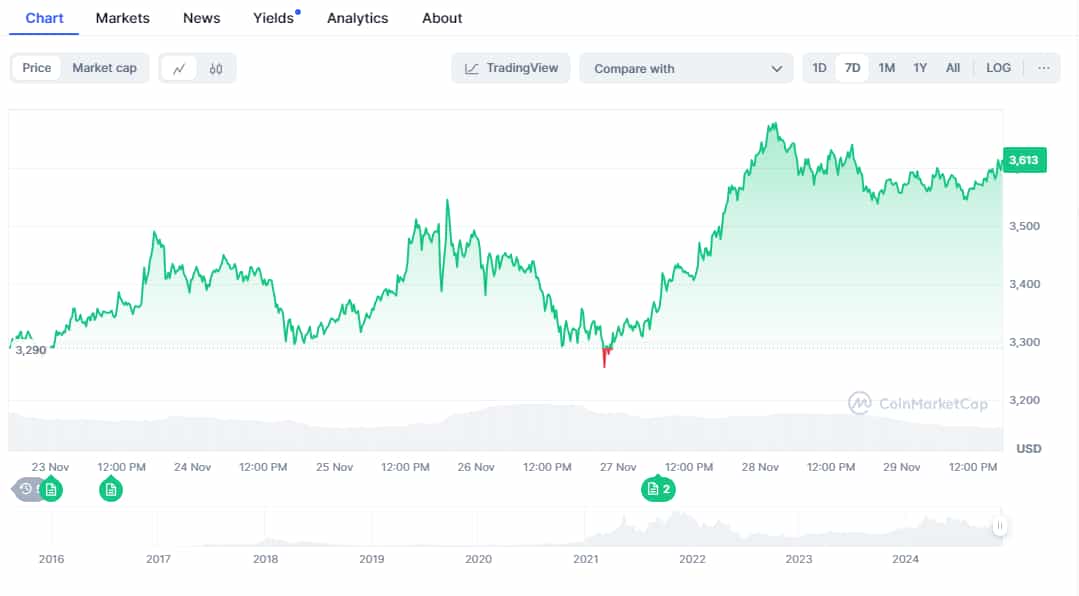 Au moment de mettre sous presse, Ethereum s’échangeait à 3 609 $ avec des gains quotidiens d’environ 0,1 %, tandis que sur la période hebdomadaire, l’ETH était en hausse de près de 10 %.