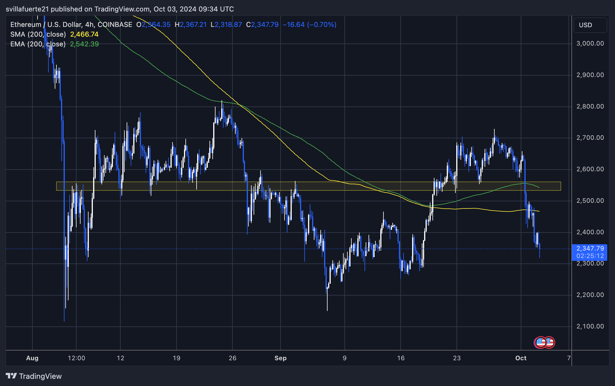 Ethereum (ETH) se négocie à 2 350 $ après avoir échoué à établir un sommet supérieur à 2 820 $. Cette récente évolution des prix a déçu les taureaux, car l’ETH a perdu des niveaux de support cruciaux, notamment la moyenne mobile exponentielle (EMA) sur 4 heures 200 à 2 542 $ et la moyenne mobile simple (MA) à 2 466 $.