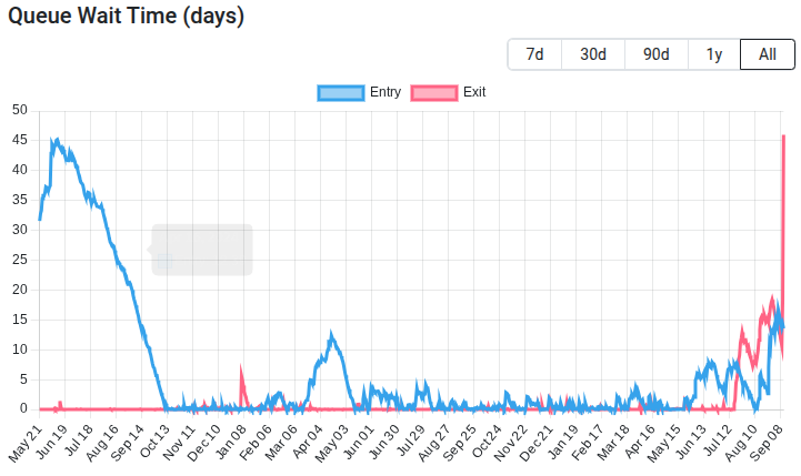 La file d’attente de sortie ETH marquée atteint 45 jours, la plus élevée en plus de deux ans