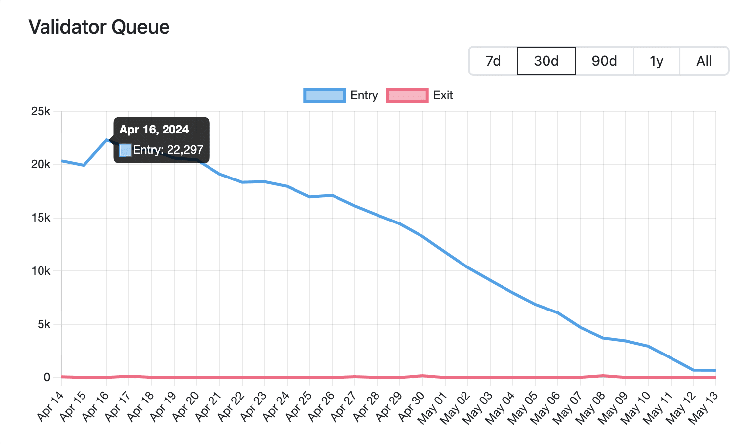 Mais comme indiqué ci-dessus, la situation s’est dégradée depuis. Les dernières données montrent que seules 704 adresses uniques ont choisi de rejoindre la file d'attente de staking Ethereum le 12 mai, reflétant une baisse de 98 % par rapport au pic local enregistré le 16 avril.