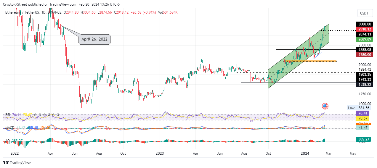 Le prix de l’Ethereum (ETH) a abandonné mardi le niveau psychologique de 3 000 $, un niveau testé pour la dernière fois le 26 avril 2022, il y a près de deux ans. Cela survient un jour après que le jeton Proof-of-Stake (PoS) a surperformé le BTC avec des gains hebdomadaires à deux chiffres et une hausse de l’intérêt ouvert.