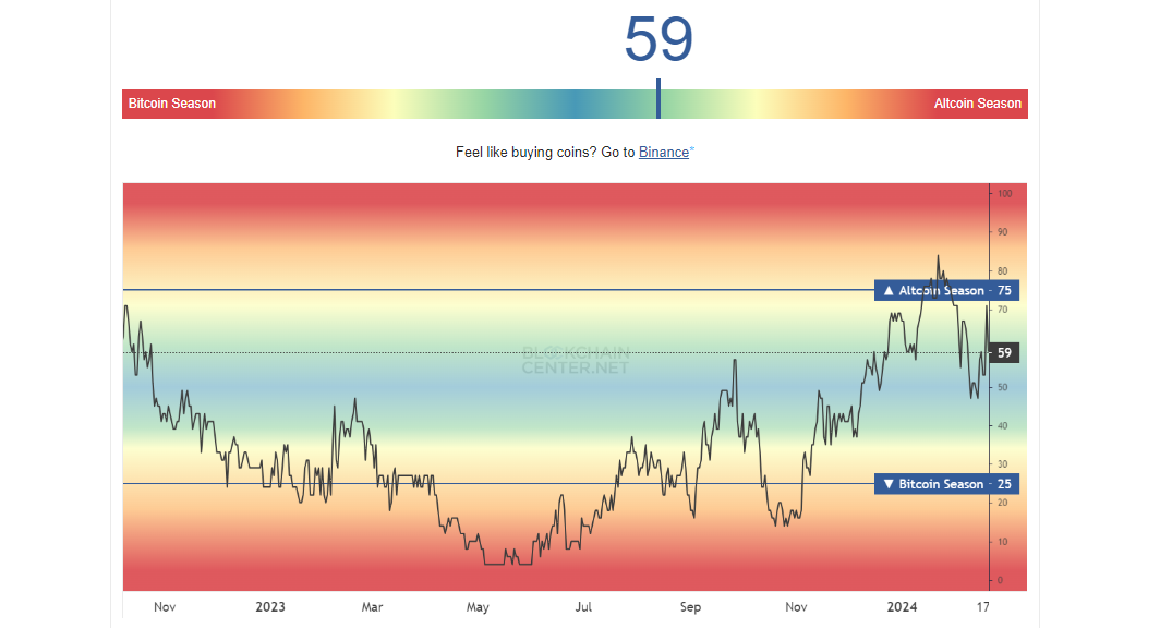 La saison alternative est un terme familier utilisé pour décrire une phase où investir dans les altcoins offre de meilleurs rendements que Bitcoin ou Ethereum. Par conséquent, la domination du Bitcoin sur le marché diminue et celle des altcoins augmente. L’indicateur de saison alternative de BlockchainCenter penche également en faveur d’une éventuelle saison altcoin par opposition à une saison Bitcoin.