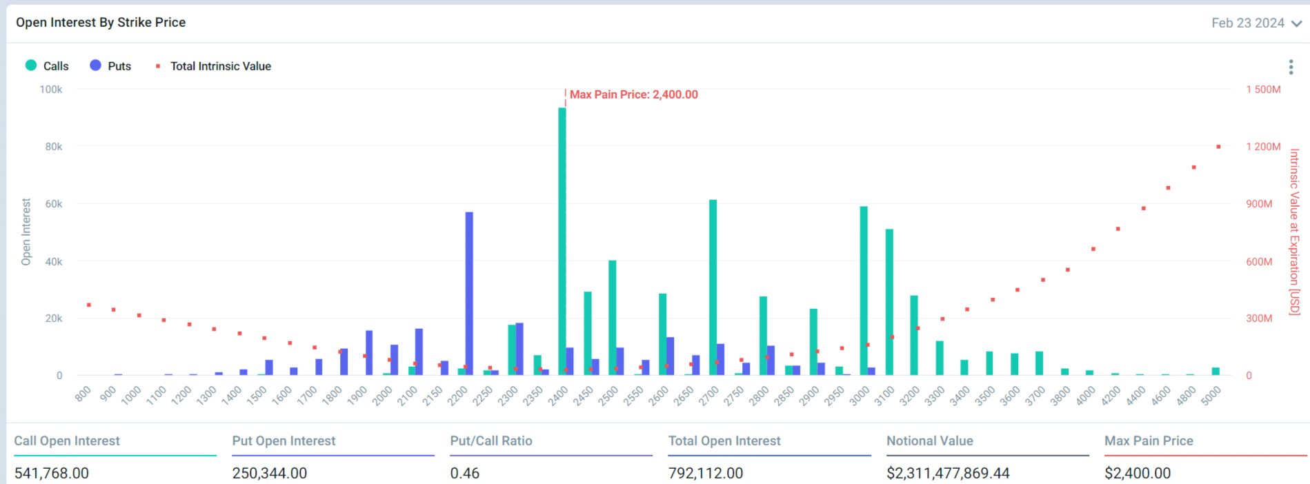 De plus, 792 000 options ETH d’une valeur notionnelle de 2,4 milliards de dollars devraient expirer, avec un ratio d’achat de vente de 0,49. Le point douloureux maximum est de 2 400 $. Les traders d’options et de contrats à terme sont optimistes sur Ethereum et font des paris plus élevés
