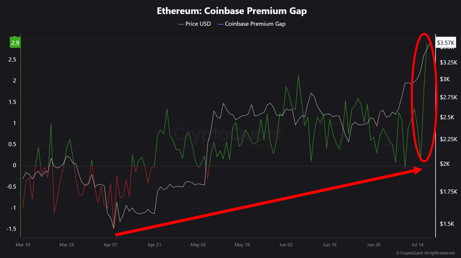 Dans un aperçu distinct, un autre analyste cryptoque, Crypto Dan, a noté des signes croissants de participation institutionnelle à l’accumulation d’Ethereum. Selon son analyse, ETH se négocie à une prime sur Coinbase, une plate-forme fréquemment utilisée par les institutions américaines et les grands investisseurs, indiquant un intérêt d’achat accru des baleines.