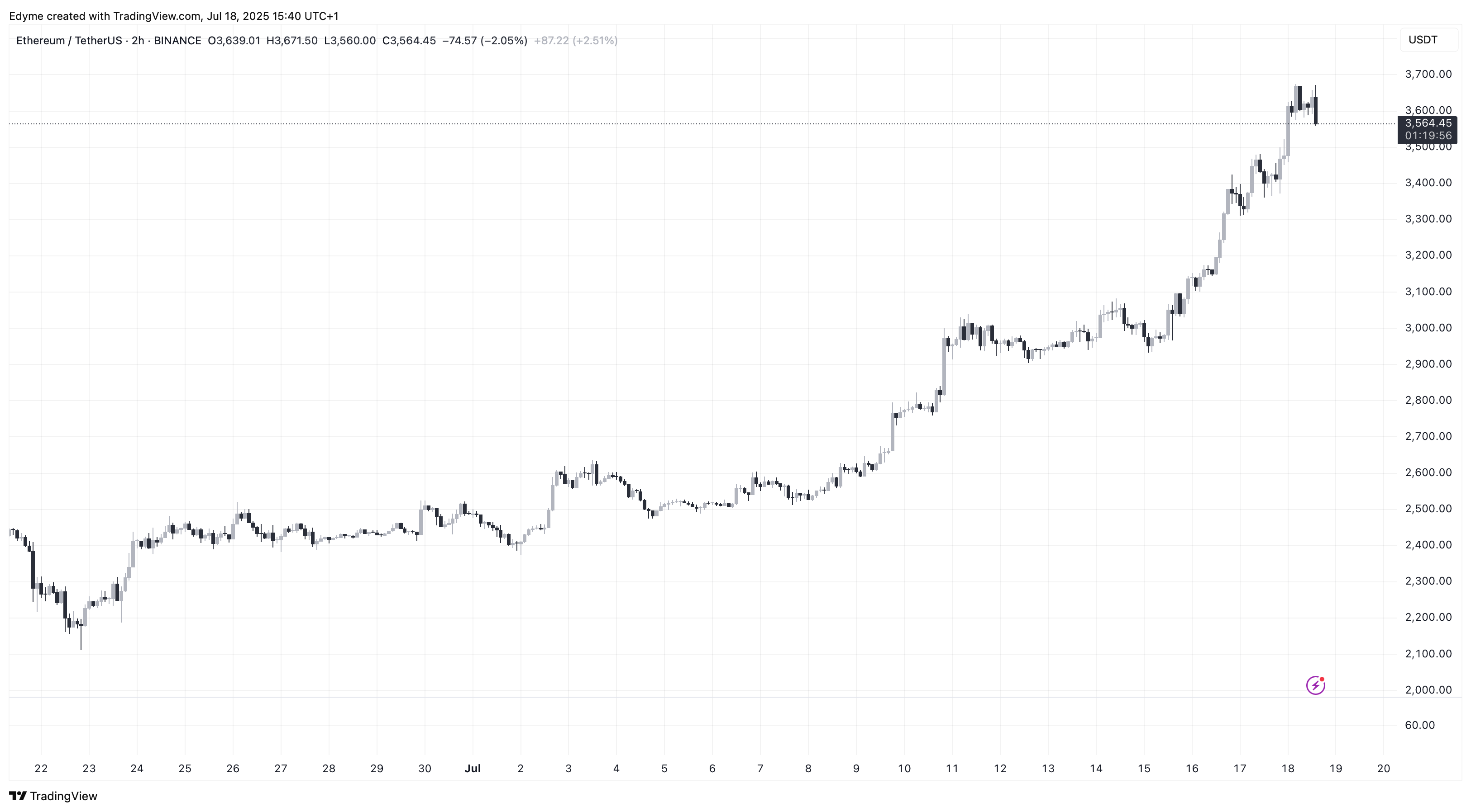 Ethereum a prolongé son élan à la hausse cette semaine, grimpant plus de 20% au cours des sept derniers jours et dépassant 3 600 $ pour la première fois depuis des mois. Au moment de la rédaction, l’ETH se négocie à 3 617 $, marquant une augmentation de 5,4% au cours des dernières 24 heures.