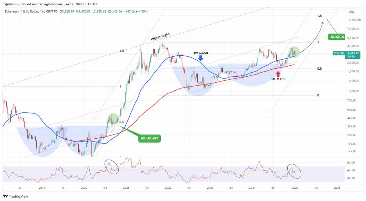 Martinez n’est pas le seul analyste technique optimiste sur l’ETH : un chercheur pseudonyme en cryptographie a fixé un objectif de prix encore plus ambitieux de 10 000 $ dans un article publié le 17 janvier.