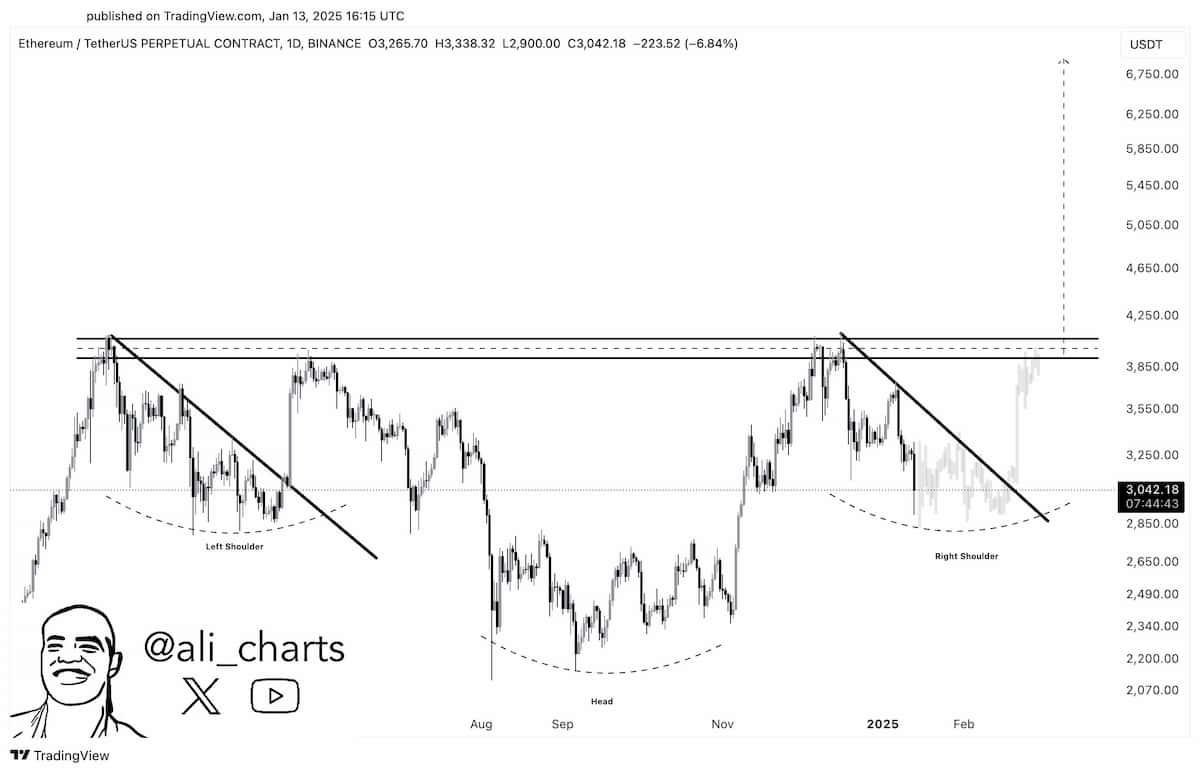Dans le cas de ce modèle, la résistance est tracée à l’aide des deux « épaules », qui représentent dans ce cas un prix d’environ 4 000 $. Avec un modèle tête-épaule, la distance entre la résistance et le point le plus bas de la « tête » est ajoutée à ce niveau pour fournir un objectif de prix. Selon le graphique de Matinez, le prix de l’Ethereum pourrait atteindre 6 750 $, ce qui équivaut à une hausse de 97,02 %.