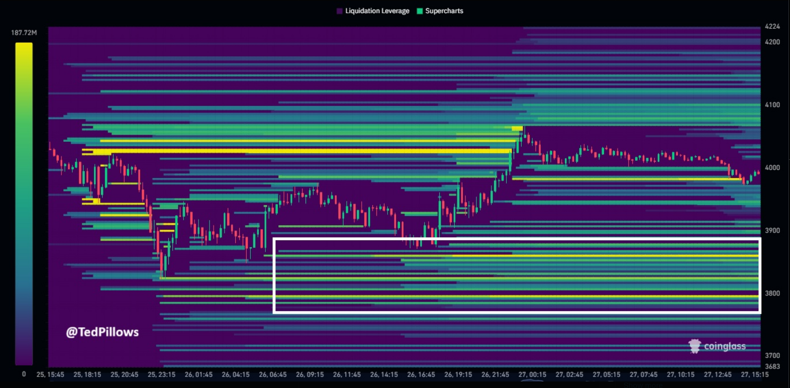 L’analyste de Crypto TED Oilers a averti que la zone de 3 700 $ à 3 800 $ pourrait faire face à une forte pression. Les rapports notent que si l’ETH tombe en dessous de 3 700 $, de nombreuses positions de marge pourraient être anéanties et étincelle la vente forcée qui fait baisser les prix.