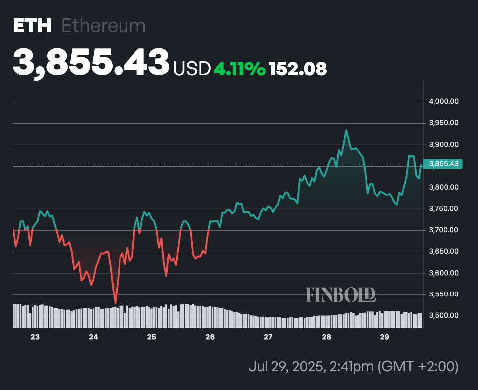 Au moment de la presse, Ethereum se négociait à 3 854 $, en baisse de 0,82% au cours des dernières 24 heures, mais en hausse de 4,11% par rapport à la semaine dernière.