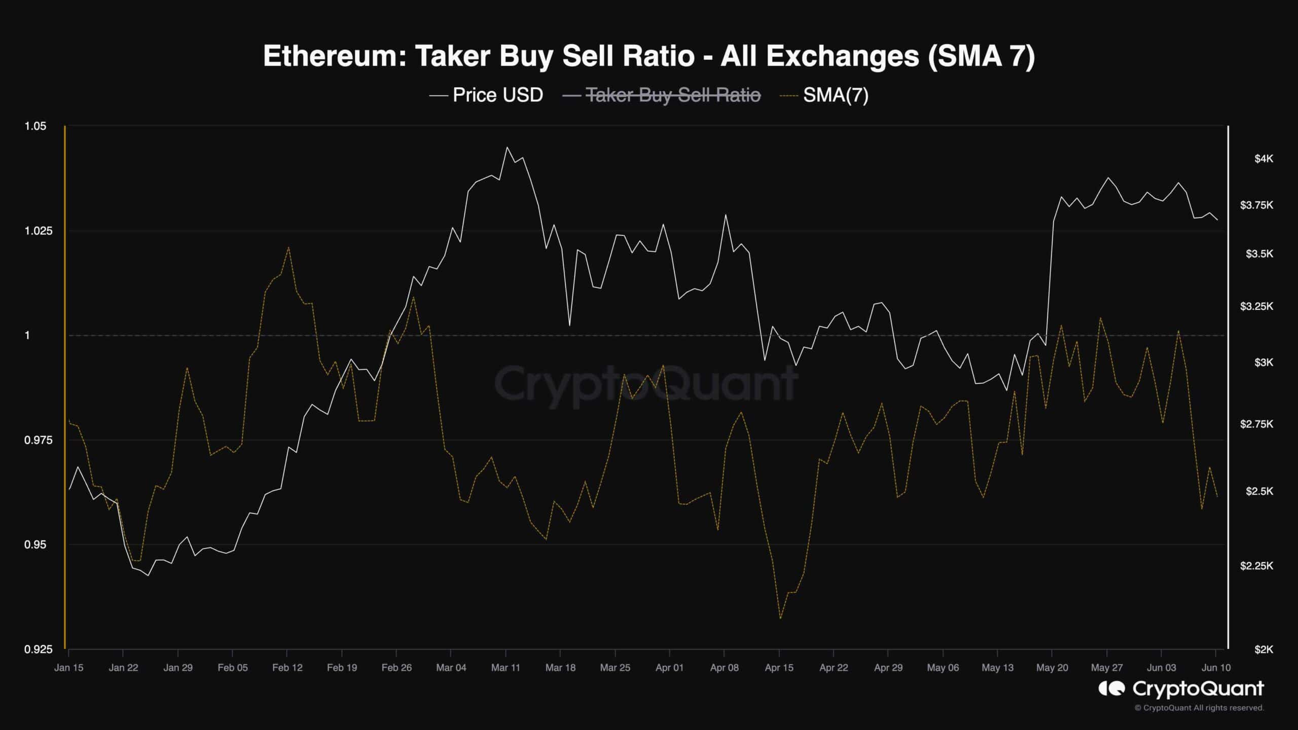 Comme le montre le graphique, le ratio n’a pas réussi à dépasser un et a fortement diminué ces derniers jours. Cette tendance suggère que la majorité des traders à terme ont vendu Ethereum de manière agressive, soit à des fins spéculatives, soit pour réaliser des bénéfices. Cette baisse significative de la mesure est un signal baissier, suggérant que le retracement baissier actuel pourrait persister si cette tendance se poursuit.