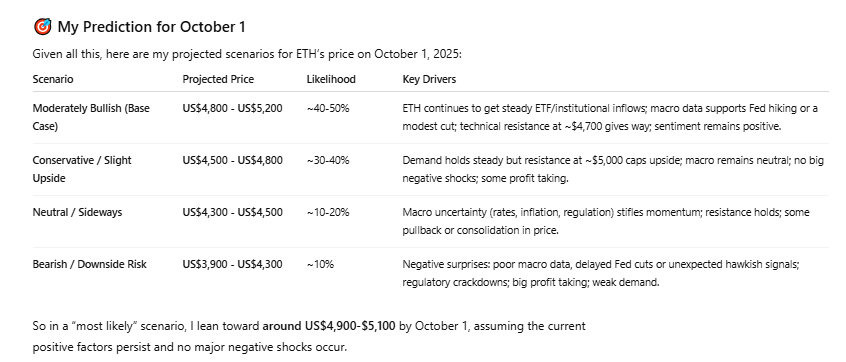 Selon Chatgpt, la crypto-monnaie de deuxième rang par capitalisation boursière est plus susceptible d’échanger une fourchette de 4 800 $ à 5 200 $ d’ici le 1er octobre.