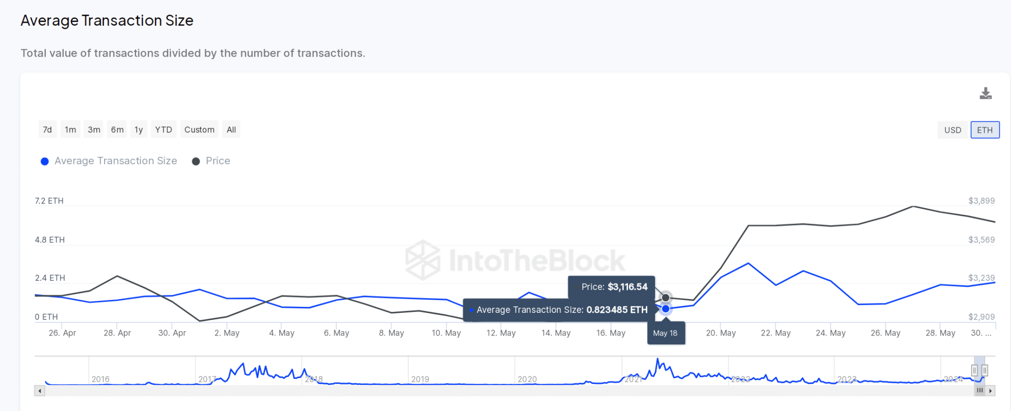 Comme vu ci-dessus, la taille moyenne des transactions Ethereum s'élevait à 1,03 ETH au 19 mai. Cependant, depuis l'approbation de l'Ethereum ETF, ce chiffre a continué d'augmenter considérablement.