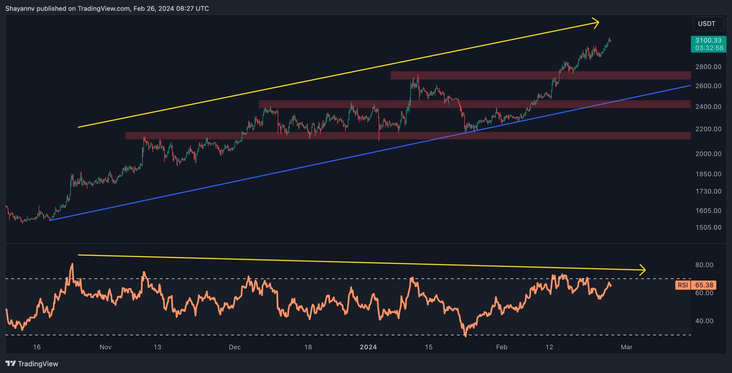 Un examen plus attentif du graphique journalier révèle le rallye impressionnant d’Ethereum après un rebond par rapport à la moyenne mobile sur 100 jours, confirmant sa force alors qu’il récupère la zone de résistance de 2,8 000 $. L’évolution récente des prix indique un fort sentiment haussier, avec des attentes croissantes pour qu’Ethereum atteigne un nouveau sommet historique (ATH) en 2024.