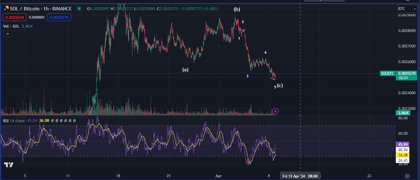 Le trader surveille également la paire Solana contre Bitcoin (SOL/BTC). Selon le commerçant, SOL/BTC a probablement atteint un plancher local à environ 0,00246 BTC (170 $) après avoir complété une vague corrective ABC.