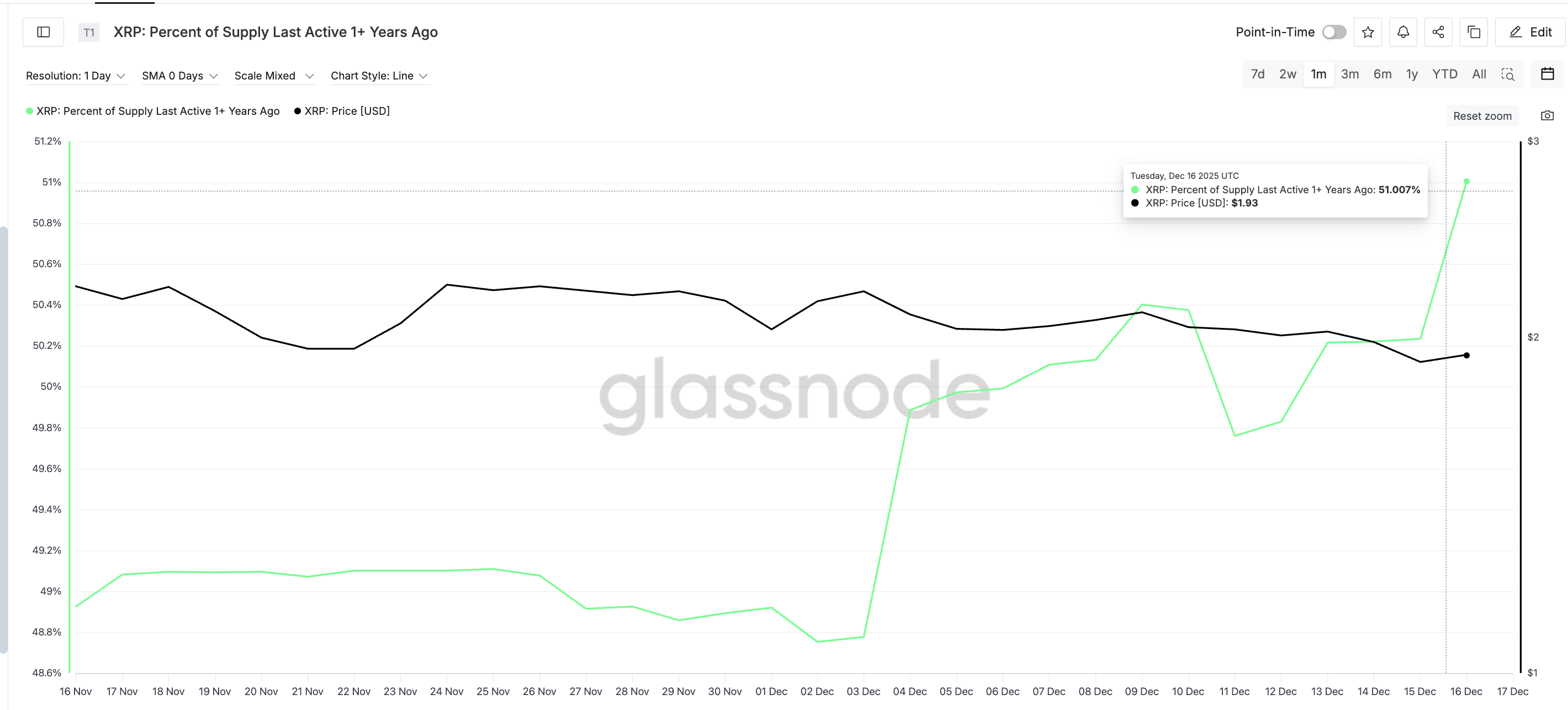 Un signal inquiétant vient du pourcentage d’offre de XRP actif pour la dernière fois il y a plus d’un an. Cette mesure est passée de 48,75 % le 2 décembre à 51,00 %, son niveau le plus élevé depuis environ un mois. Lorsque des pièces plus anciennes commencent à bouger, cela signifie souvent que l’offre de longue date devient active, ce qui peut ajouter une pression de vente même sans panique.