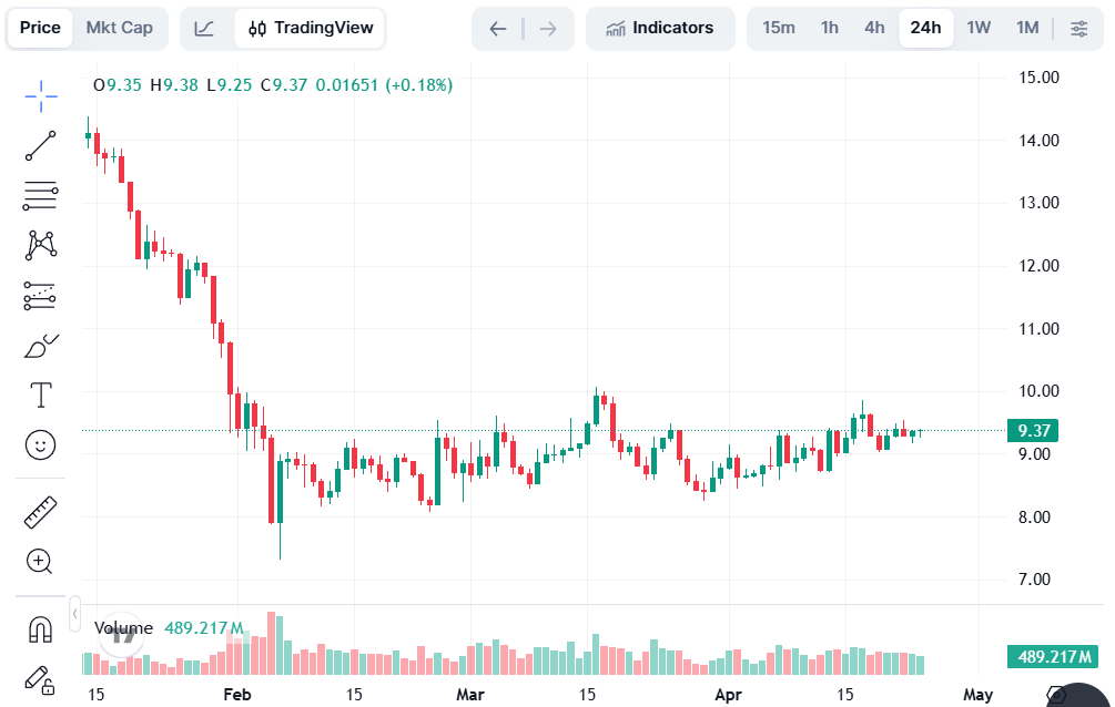 Les actifs tokenisés du monde réel ont généré 27 milliards de dollars en 2026, Chainlink jouant un rôle clé en tant qu’infrastructure sous-jacente aux actions, aux fonds et aux obligations. Même avec de tels chiffres, le prix est resté dans une fourchette comprise entre 8 et 10 dollars.
