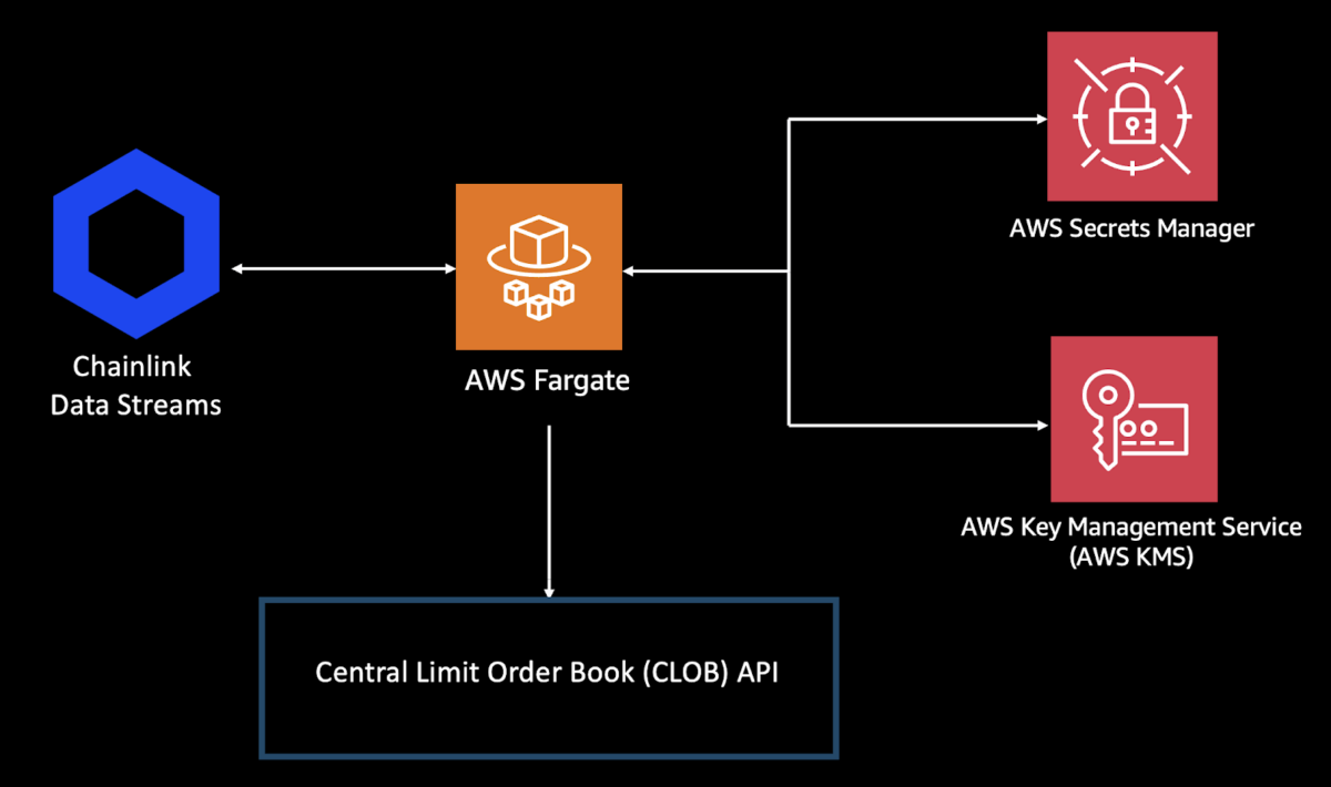 Il existe un consommateur de flux de données et un service de trading déployés sur AWS Fargate qui maintiennent une connexion continue aux flux de données Chainlink. Les actions suivantes ont lieu chaque fois que des mises à jour de prix signées se produisent :