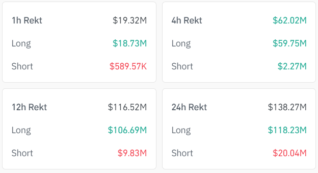 Cette baisse a déclenché une vague de liquidations d’une valeur de 116,52 millions de dollars, dont la majeure partie (106,52 millions de dollars) provient de transactions longues. Au cours des dernières 24 heures, le chaos du marché s’est accru, les liquidations ayant touché 49 351 traders.