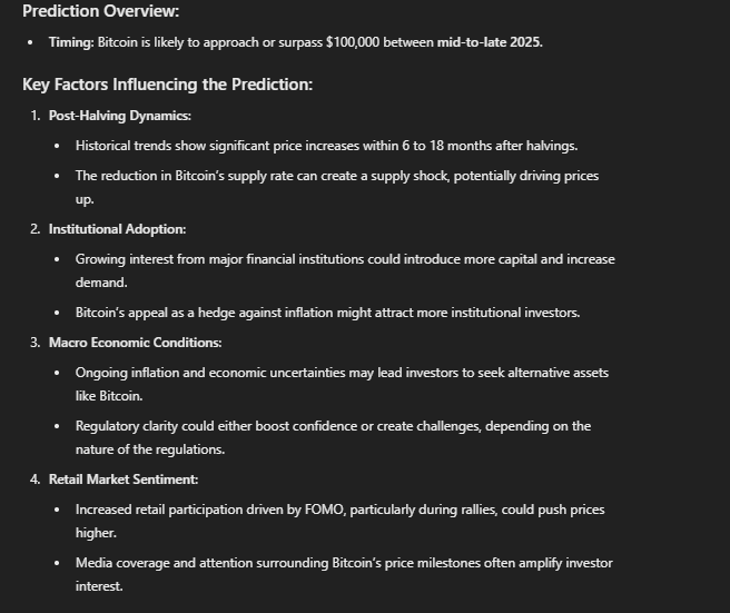 Sur la base de ces facteurs, ChatGPT-4o a prédit que Bitcoin pourrait atteindre 100 000 $ d’ici le milieu ou la fin de 2025. Cela nécessiterait que Bitcoin rebondisse de plus de 40 % aux niveaux actuels.