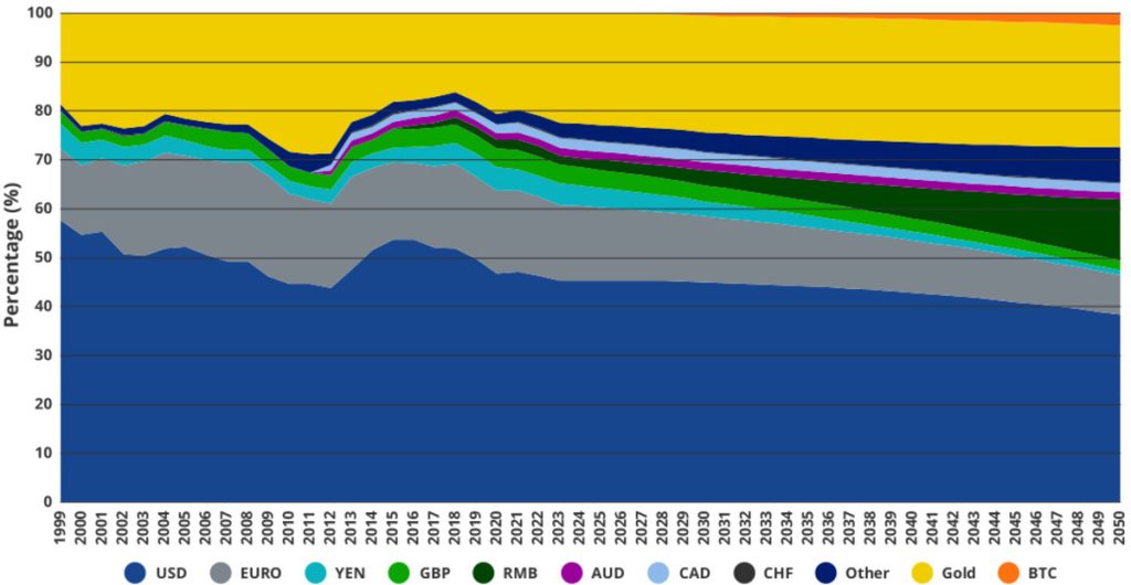 Pour comprendre le rôle potentiel du Bitcoin dans le paysage financier futur, il est crucial d’examiner les tendances actuelles et changeantes du système monétaire international (IMS). Les tendances persistantes dans l’IMS favorisent l’ascension du Bitcoin alors que les économies mondiales se détournent des devises de réserve actuelles. Nous théorisons que le principal moteur de ce changement sera le déclin du PIB global relatif des leaders économiques actuels tels que les États-Unis, l’UE, le Royaume-Uni et le Japon. Ces changements seront encore catalysés par la diminution de la confiance dans les devises de réserve actuelles en tant que réserves de valeur à long terme en raison des dépenses déficitaires incontrôlées et des décisions géopolitiques à court terme des nations émettrices. Notamment, les préoccupations concernant les droits de propriété garantis par les systèmes monétaires et financiers occidentaux, en particulier aux États-Unis, sont en augmentation.